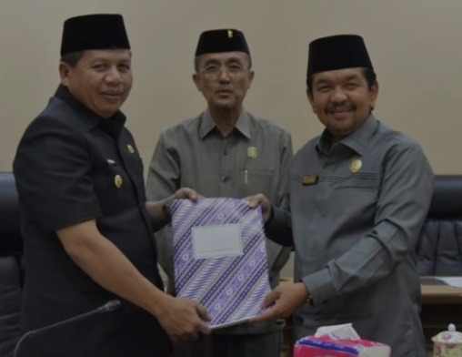 PJ Bupati Henrizal saat menerima dokumen pandangan umum fraksi DPRD dari pimpinan rapat paripurna Tontawi Jauhari