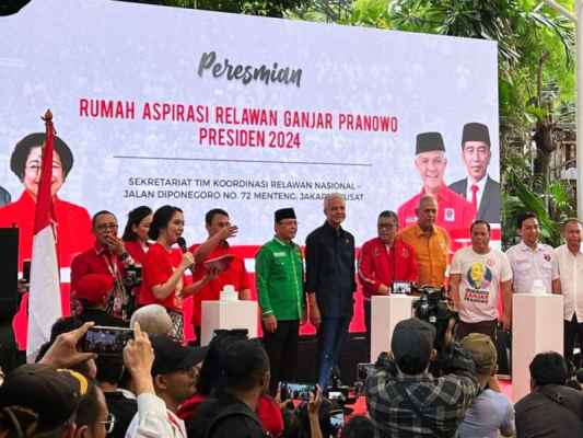 JAKARTA – Bakal calon presiden 2024 dari PDI Perjuangan (PDIP) Ganjar Pranowo meresmikan Rumah Aspirasi Relawan Pemenangan yang sekaligus menjadi Sekretariat Tim Koordinasi Relawan Pemenangan Pilpres 2024. Ganjar hadir bersama elite PDIP, PPP, dan Partai Hanura.