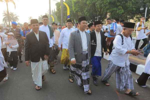 Usai melepas rombongan, Arief, bersama wakilnya, juga turut serta jalan santai sarungan bersama masyarakat.