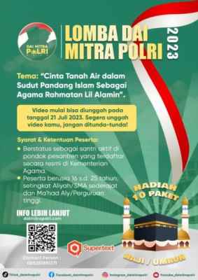 Untuk informasi lebih lanjut dan untuk berpartisipasi dalam kompetisi DAI MITRA POLRI 2023, silakan kunjungi https://daimitrapolri.com/ atau di platform sosial media lainnya: