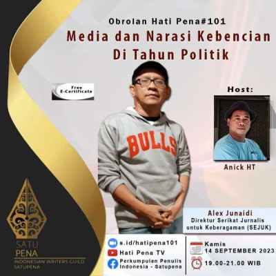 Obrolan Hati Pena #101 tentang Media dan Narasi Kebencian itu akan berlangsung di Jakarta pada Kamis malam, 14 September 2023, pukul 19.00-21.00 WIB.
