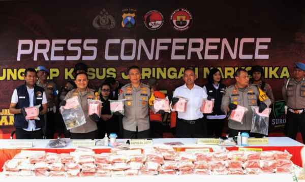 Dalam konferensi pers yang digelar di Mapolrestabes Surabaya itu, Kapolda Jatim menyampaikan bahwa pasangan suami istri berinisial MT (30) dan RT (28) berhasil ditangkap sebagai kurir narkoba dalam jaringan antar provinsi.