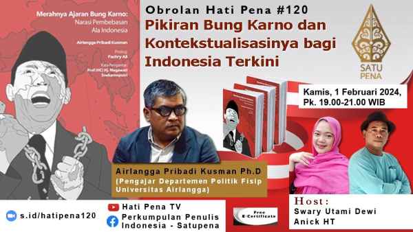 Obrolan Hati Pena #120 tentang pikiran Bung Karno, sekaligus bedah buku “Merahnya Ajaran Bung Karno, Narasi Pembebasan Ala Indonesia,” itu akan berlangsung di Jakarta, Kamis malam, 1 Februari 2024, pukul 19.00-21.00 WIB.