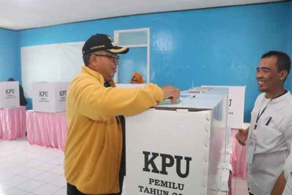 SUKABUMI – Bupati Sukabumi H. Marwan Hamami memberikan hak suara untuk Pemilu serentak 2024 di TPS 5 RW 11 Desa Pasirhalang Cimahpar Kecamatan Sukaraja. Rabu 14 Februari 2024.