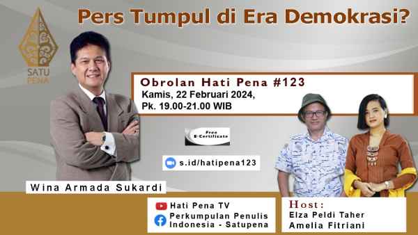 JAKARTA – Perkumpulan Penulis Indonesia, SATUPENA, akan menghadirkan wartawan senior Wina Armada Sukardi, sebagai nara sumber untuk mendiskusikan apakah benar pers tumpul di era demokrasi.
