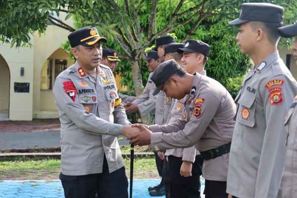 Setelah pelaksanaan Apel, Kapolres Sarolangun AKBP Budi Prasetya, S.IK, M. Si menyalami satu persatu personilnya diikuti Waka Polres Sarolangun dan seluruh periwra.(Sanu)