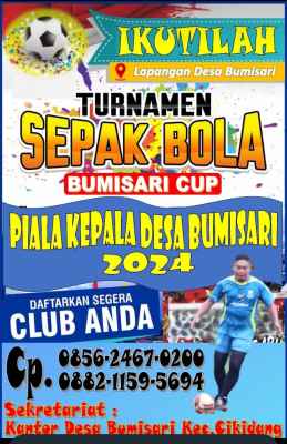 - Kontak Panitia: 0856 2467 0200 0882 1159 5694 (atas nama panitia Turnamen Sepak Bola Bumisari Cup 2024)