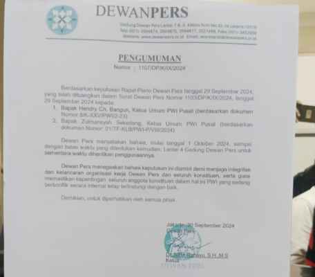 Diketahui sebelumnya, Hendry Ch Bangun dan pendukungnya terus menolak keputusan Dewan Pers No.1103/DP/K/IX/2024, tanggal 29 September 2024, yang melarang sementara PWI Pusat berkantor di lantai 4 Gedung Dewan Pers mulai 1 Oktober 2024 hingga kisruh di tubuh PWI terselesaikan.