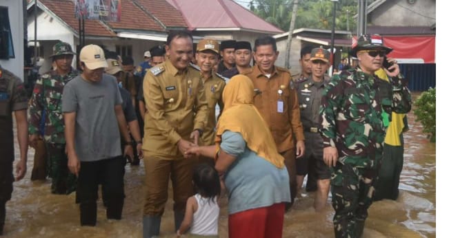 Dalam kegiatan tersebut, Bupati Sarolangun Hurmin didampingi Wakil Bupati Sarolangun Gerry Trisatwika beserta rombongan tampak meninjau lokasi banjir yang cukup membuat aktivitas masyarakat terganggu.