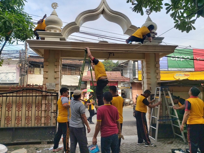 Kapolres Metro Tangerang Kota Kombes Pol Zain Dwi Nugroho bersama Wakapolres AKBP Eko Bagus Riyadi dan sejumlah pejabat utama (PJU) menggelar kegiatan bakti religi dengan melakukan aksi gotong royong membersihkan area luar dalam dan mengecat gapura Masjid Jami’ An-Nur di Kelurahan Kebon Besar, Kecamatan Batuceper, Kota Tangerang, Banten. Jum’at (20/6/2025).