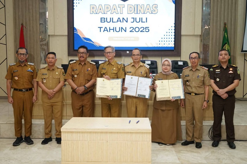 SUKABUMI- Bupati Sukabumi, H Asep Japar memimpin langsung Rapat Dinas Bulan Juli 2025 yang digelar di Aula Sekretariat Daerah Kabupaten Sukabumi, Senin (21/7/2025). Agenda rutin ini membahas evaluasi kinerja dan arah strategis pembangunan daerah ke depan.