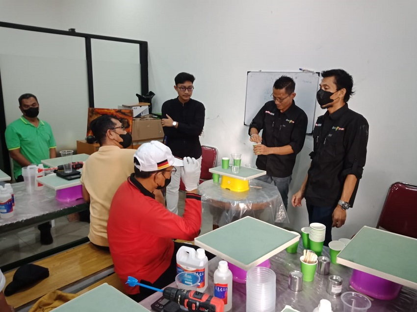 Pelatihan yang dipandu langsung oleh Trainer resin berpengalaman Agus Rudy dan Teguh Setya Budi ini mengajarkan peserta cara melapisi panel dengan motif unik yang menyerupai marmer, ombak, hingga bentuk alami lainnya.