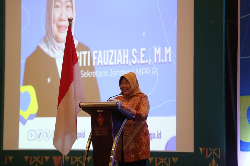Sekjen MPR Siti Fauziah saat menyampaikan sambutan saat acara Sosialisasi MPR bersama Pemerintah Daerah yang bertajuk ” Penguatan Tata Kelola Sumber Daya Alam Melalui Publikasi Media dalam Mendukung Pembangunan Daerah”, di Lombok Barat, Nusa Tenggara Barat, Jumat (11/7/2025).