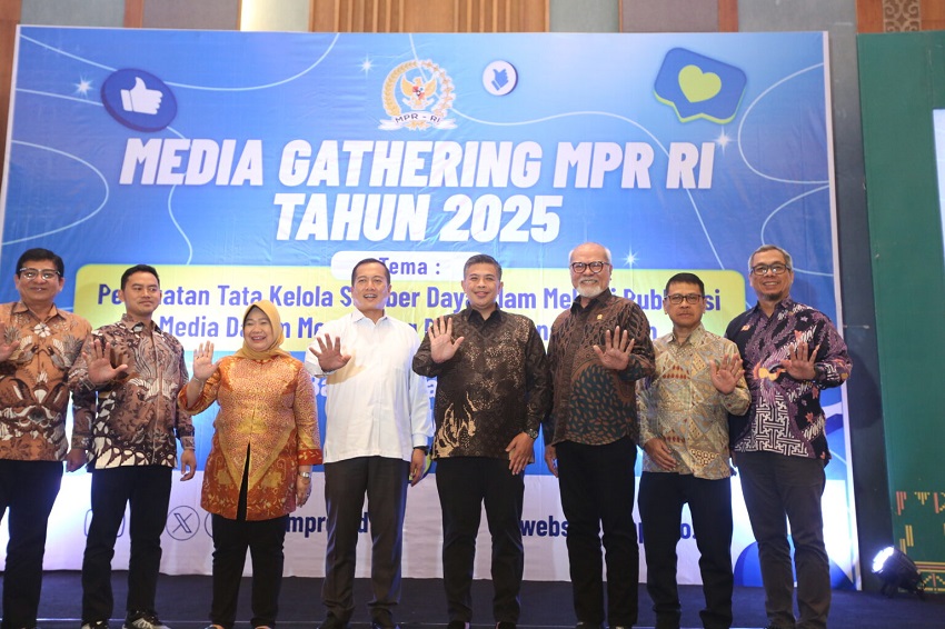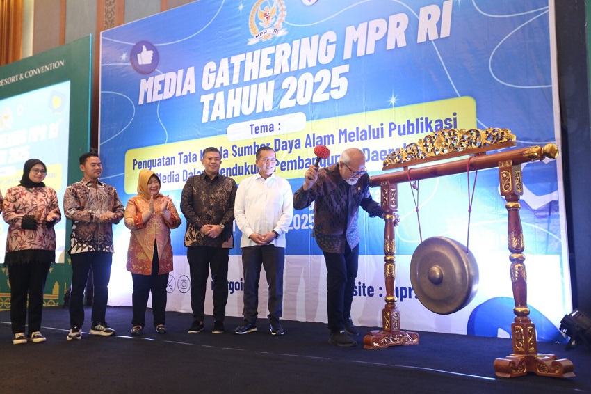 Gubernur Nusa Tenggaara Barat (NTB) Lalu Muhamad Iqbal, Anggota Badan Sosialisasi MPR dari Kelompok DPD Abraham Liyanto, Anggota MPR Fraksi Gerindra Dapil Bali I Dewa Gede Agung Widiarsana, Sekjen MPR Siti Fauziah dan Ketua KWP Ariawan, menhadiri acara Sosialisasi MPR bersama Pemerintah Daerah yang bertajuk ” Penguatan Tata Kelola Sumber Daya Alam Melalui Publikasi Media dalam Mendukung Pembangunan Daerah”, di Lombok Barat, Nusa Tenggara Barat, Jumat (11/7/2025).