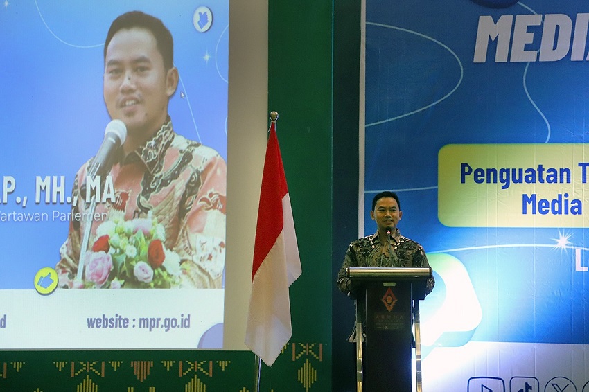 Ketua KWP Ariawan saat menyampaikan sambutan saat acara Sosialisasi MPR bersama Pemerintah Daerah yang bertajuk ” Penguatan Tata Kelola Sumber Daya Alam Melalui Publikasi Media dalam Mendukung Pembangunan Daerah”, di Lombok Barat, Nusa Tenggara Barat, Jumat (11/7/2025).