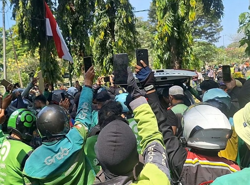 Massa ojol bersama warga berbondong-bondong mendatangi Mako Brimob Kwitang, menuntut pertanggungjawaban serta keadilan atas insiden yang merenggut nyawa Affan.*