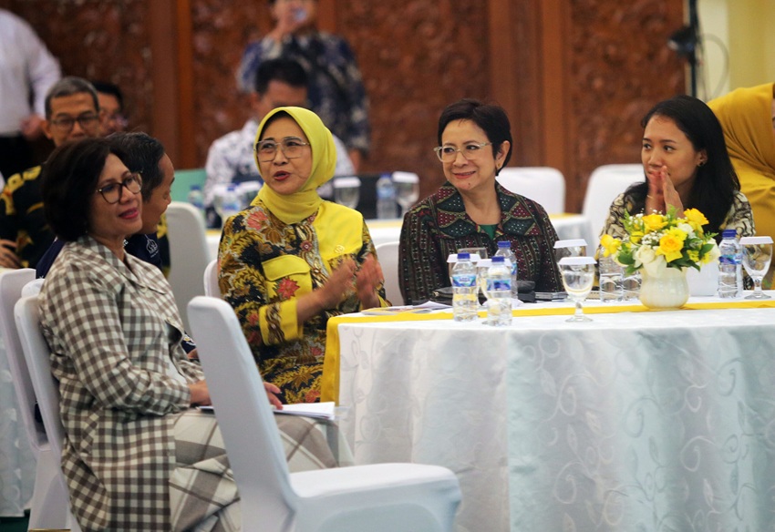 Anggota MPR RI F-Golkar Hetifah Sjaifudian, Putri Komarudin dan Nurul Arifin saat acara Sarasehan Nasional Fraksi Partai Golkar MPR RI di Nusantara IV, Gedung Parlemen, Senayan, Jakarta, Jumat (8/8/2025).