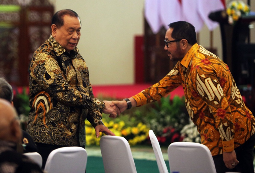 Wakil Ketua DPR RI, Kahar Muzakir menyalami Anggota DPR RI Fraksi Golkar Firman Subagio usai memberikan kata sambutan saat pembukaan Sarasehan Nasional FraksiBersama usai membuka Sarasehan Nasional Fraksi Partai Golkar MPR RI di Nusantara IV, Gedung Parlemen, Senayan, Jakarta, Jumat (8/8/2025).