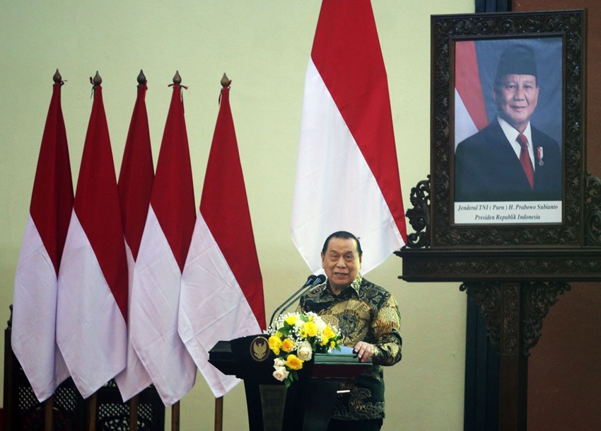 Ketua Fraksi Golkar MPR RI, Melchias Markus Mekeng memberikan kata sambutan saat pembukaan Sarasehan Nasional Fraksi Bersama usai membuka Sarasehan Nasional Fraksi Partai Golkar MPR RI di Nusantara IV, Gedung Parlemen, Senayan, Jakarta, Jumat (8/8/2025).