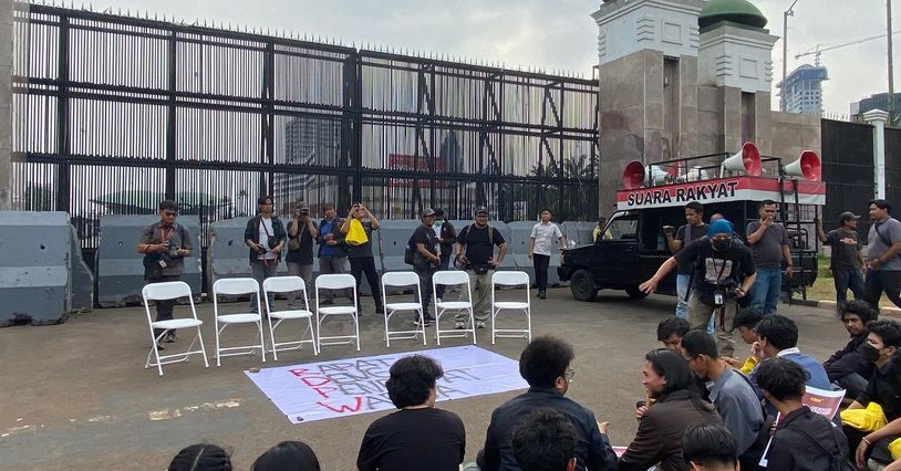 Di tengah aksi, mahasiswa menampilkan pertunjukan teatrikal bertajuk “Kursi Dewan”. Beberapa kursi plastik putih disusun menyerupai kursi sidang anggota parlemen. Dua mahasiswa duduk dengan telinga tertutup, menggambarkan wakil rakyat yang “tuli” terhadap suara masyarakat, sementara seorang mahasiswa lain berorasi menggunakan mikrofon di depan massa.