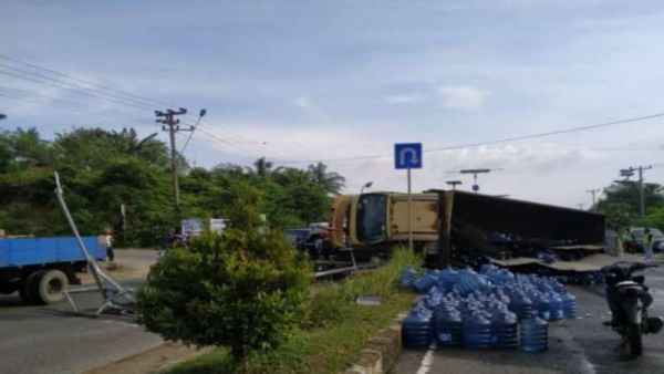 Diduga Hilang Kendali, Mobil Dump Truck Bawa Air Galon Tabrak Pembatas Jalan